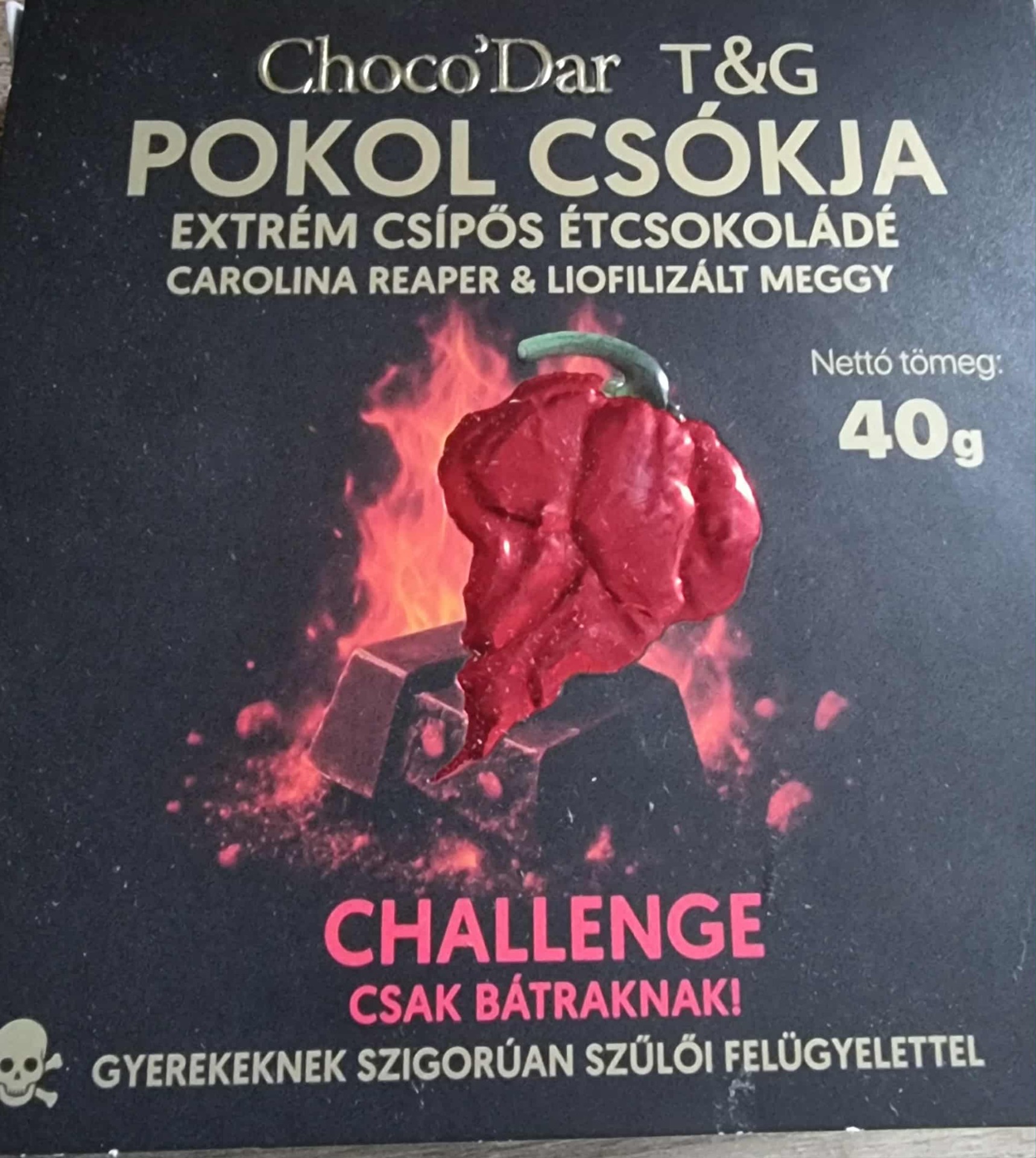 A legfinomabb étcsokoládé alap találkozik a liofilizált meggy gyümölcsös játékosságával, miközben a világ egyik legerősebb chilije, a Carolina Reaper, elhozza a pokol forró csókját.